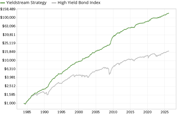 The chart below compares the performance of the Yieldstream investment strategy to a High-Yield Bond Index [2]. The Yieldstream strategy has been profitable every single year, with a compound annual growth rate (CAGR) of 12.3%. An initial investment of $1,000 in 1984 would be worth $130,919 today [1].