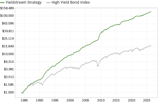 The chart below compares the performance of the Yieldstream investment strategy to a High-Yield Bond Index [2]. The Yieldstream strategy has been profitable every single year, with a compound annual growth rate (CAGR) of 12.2%. An initial investment of $1,000 in 1984 would be worth $131,742 today [1].